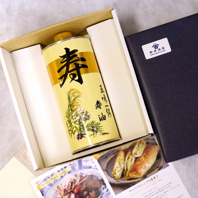 古風な缶入り「五味一体寿油」(ごみいったいことぶきあぶら)は、1931年に金田油店を17歳で継いだ三代目店主、金田勝次が生み出したブレンド油。