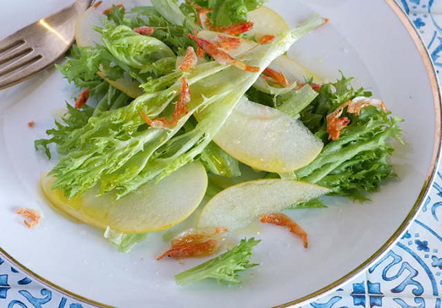 塩コショウ、ビネガーと回しかけるだけのシンプルなサラダにもオレンジの香りとほろ苦さが。