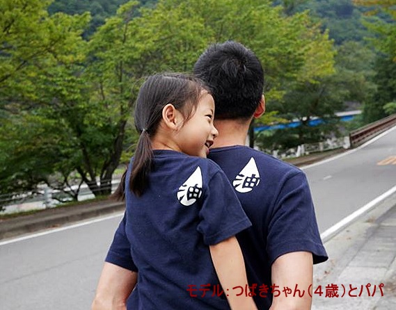 金田油店オリジナルスタッフTシャツ、通称油Tシャツ。江戸の藍染のれんを思わせる濃紺色、前面はシンプルな無地ながらバック右肩に油滴が。